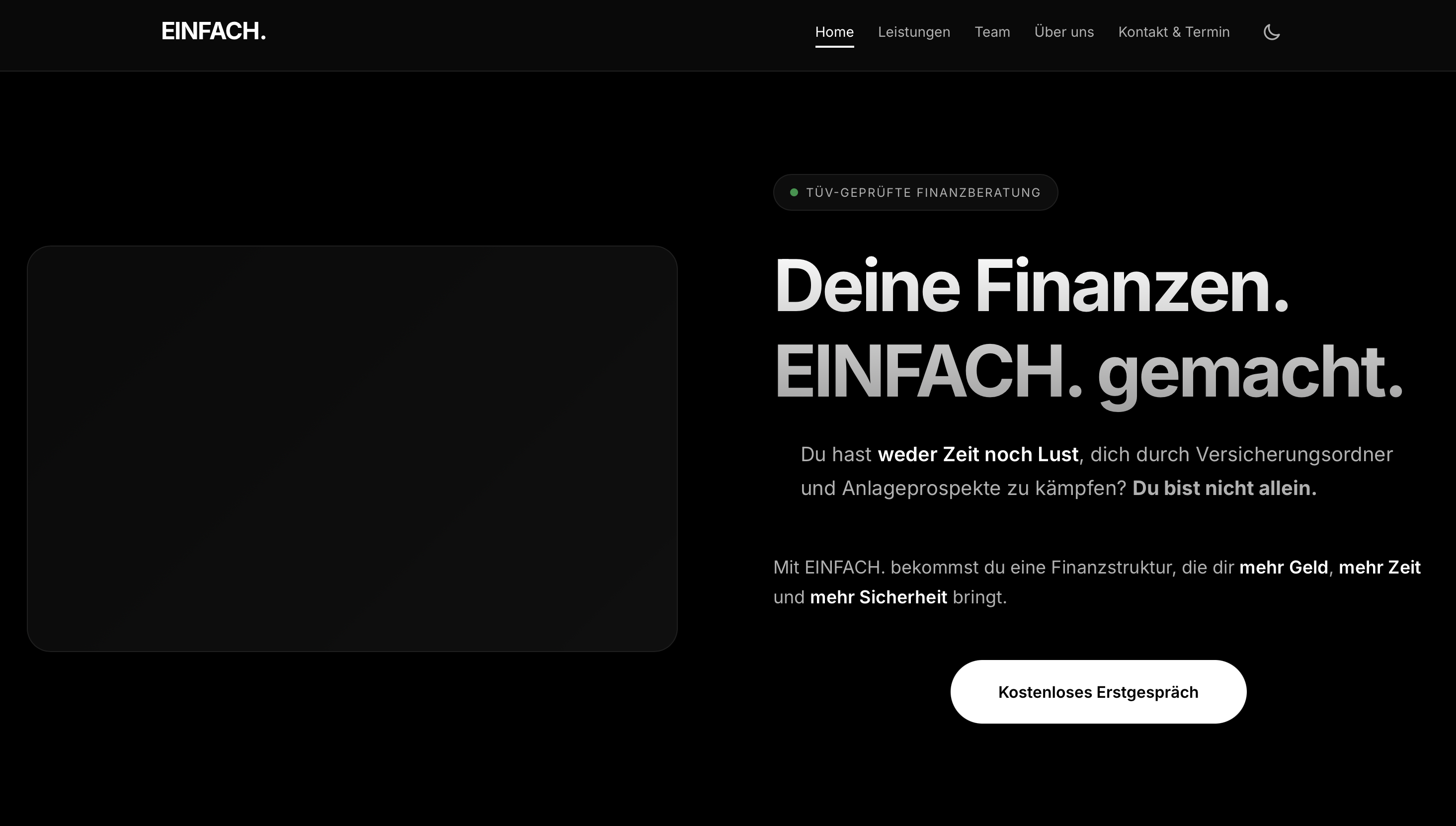 EINFACH. TECH Solution steht für messbare Ziele (Anfragen, Sichtbarkeit, Vertrauen) statt nur „schöne Websites“. Wenn du das Gefühl hast, digital hängen zu bleiben, sind wir der Partner, der dich Schritt für Schritt nach vorne bringt.